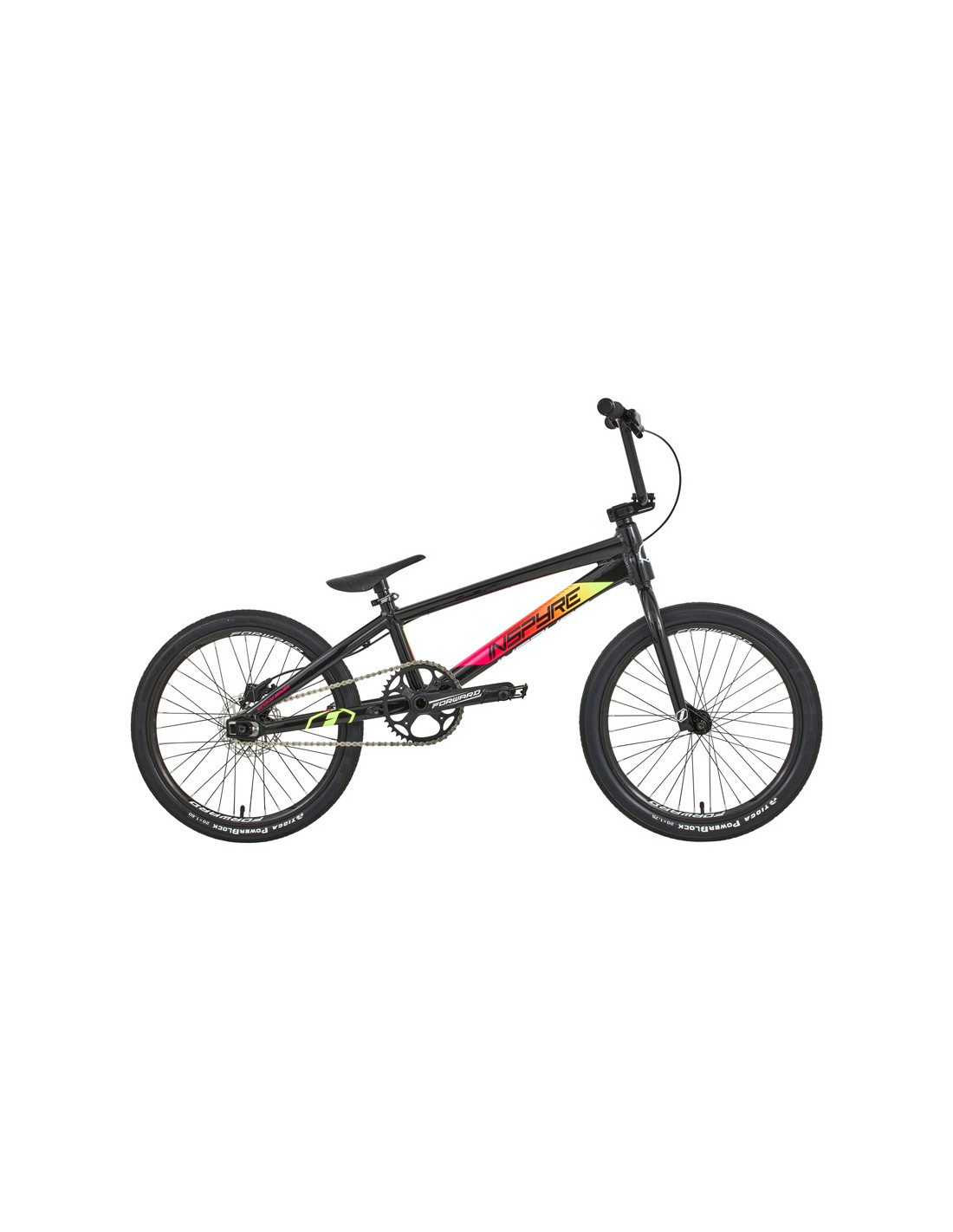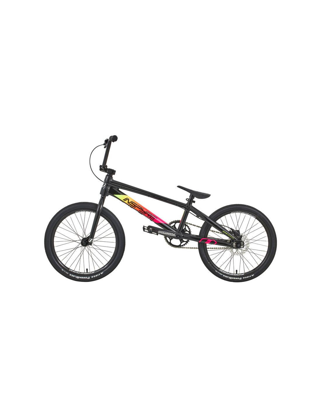 At its core, the bike is built around the Inspyre Bicycles Evo Disk frame, featuring all the characteristics of a high-end BMX Race frame. Constructed from 6061-T6 hydroformed aluminum tubing, it delivers an excellent weight to performance ratio. Its geometry strikes the perfect balance between stability and responsiveness. The frame integrates Inspyre Bicycles Swell dropouts, which not only add rear-end stiffness but also accommodate the Pride Racing disc brake mount while ensuring perfect chain tension.
