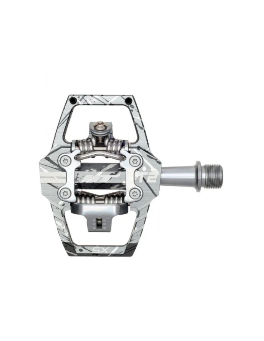 HT T2 SX pedals are the benchmark in BMX Racing. They are crafted around an extruded aluminum body before undergoing CNC machining for a perfect finish. These pedals feature a chromoly axle to enhance strength and rigidity. Equipped with new "Hook" plates, they minimize any slippage during intense efforts. With a wide range of adjustment, you can modify the spring tension by adjusting the two BTR screws to suit the rider.