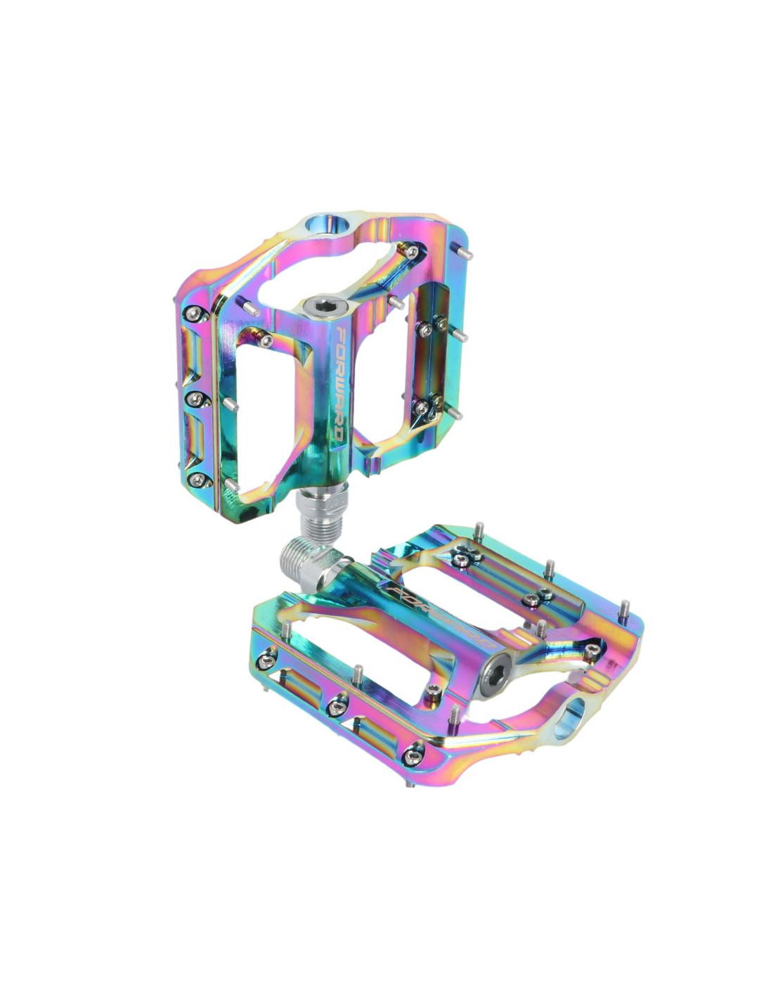 The new Forward Zenith pedals complement the range to offer a wide choice. Available in several colors with a beautiful finish and a laser logo to suit all setups. The platforms are made of extruded and CNC machined 6061 aluminum. They are mounted on a robust Cr-Mo steel axle with 3 sealed bearings. Zenith Pedals will delight riders seeking grip thanks to the 7 removable and interchangeable pins with stoppers on each face.