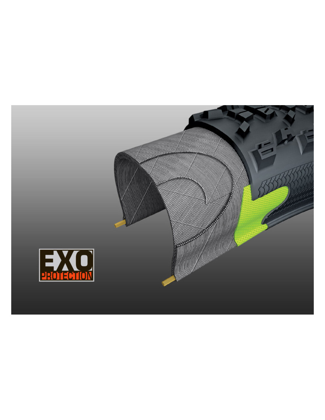 An extremely cut-resistant and abrasion-resistant material added to the sidewalls of select mountain tires. This densely woven fabric is also lightweight and highly flexible, ensuring that the performance of the tire remains unaffected. Choose EXO Protection for exceptionally rocky, treacherous trails where the chance of sidewall cuts and abrasions is high.