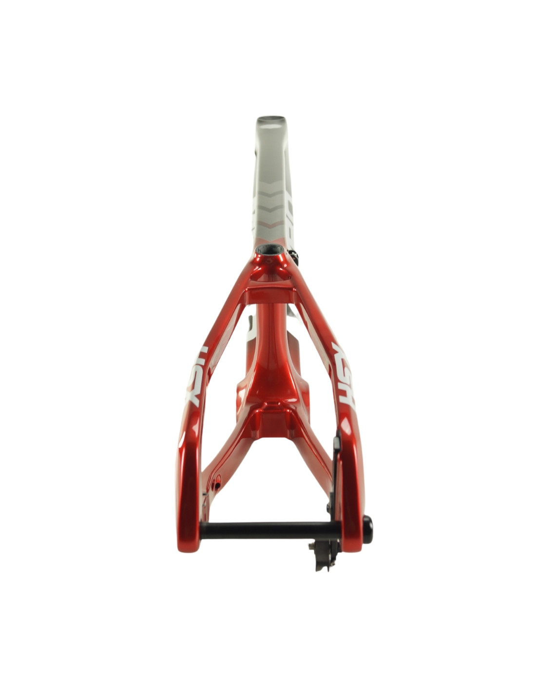 Afin de maintenir une longueur de bases arrières constante quel que soit le développement utilisé, ce cadre est livré avec un axe traversant de 15 mm. Cela augmente considérablement la rigidité de la partie arrière du cadre. Cette configuration nécessite obligatoirement un moyeu arrière avec un axe de 15 mm. L'axe lui-même est en aluminium 7005, entièrement usiné par CNC.