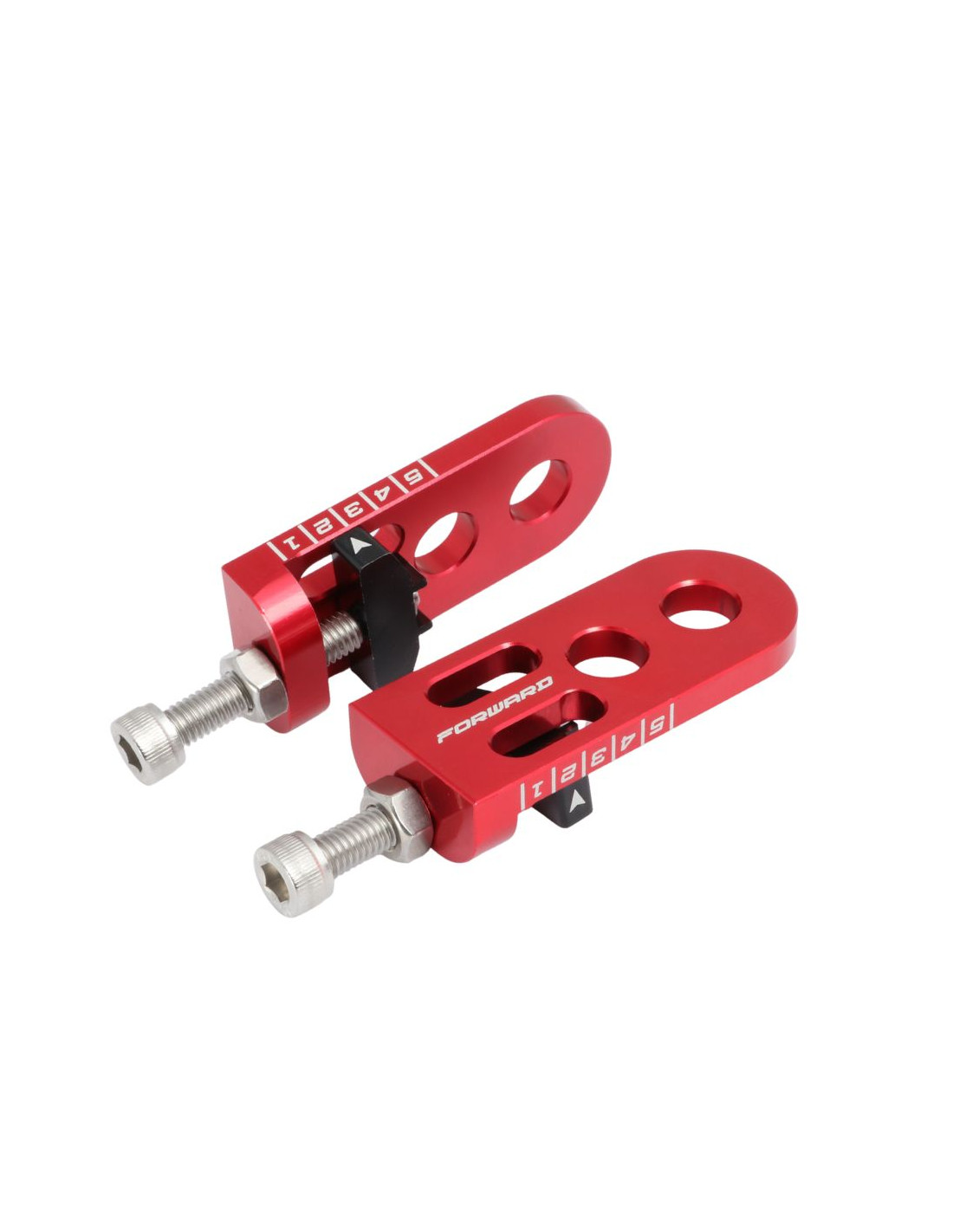 Ils sont entièrement usinés CNC en Aluminium pour une finition parfaite et possèdent 2 évidements latéraux. Compatibles avec les axes de roue de 10 mm et les cadres à pattes horizontales, ils disposent de deux points de fixation ainsi que d’une vis de réglage permettant d’ajuster la tension de la chaîne avec précision. Les repères gravés au laser sur chaque tendeur facilitent le contrôle visuel et le réglage de la tension.