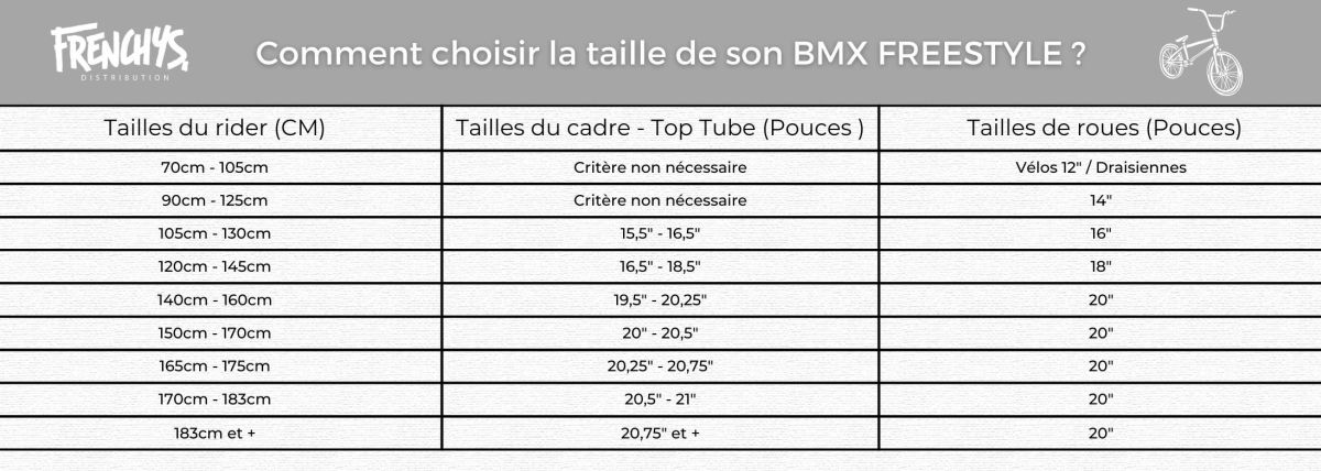 En suivant ce tableau, vous pouvez trouver une taille adéquate. Pour trouver rapidement une tranche de taille qui correspond à votre taille. Mesurez vous, et trouver votre tranche de taille dans la colonne de gauche. Ensuite vous suivez la ligne vers la droite du tableau pour trouver toutes les informations dont vous avez besoin pour trouver la bonne taille de BMX FREESTYLE.