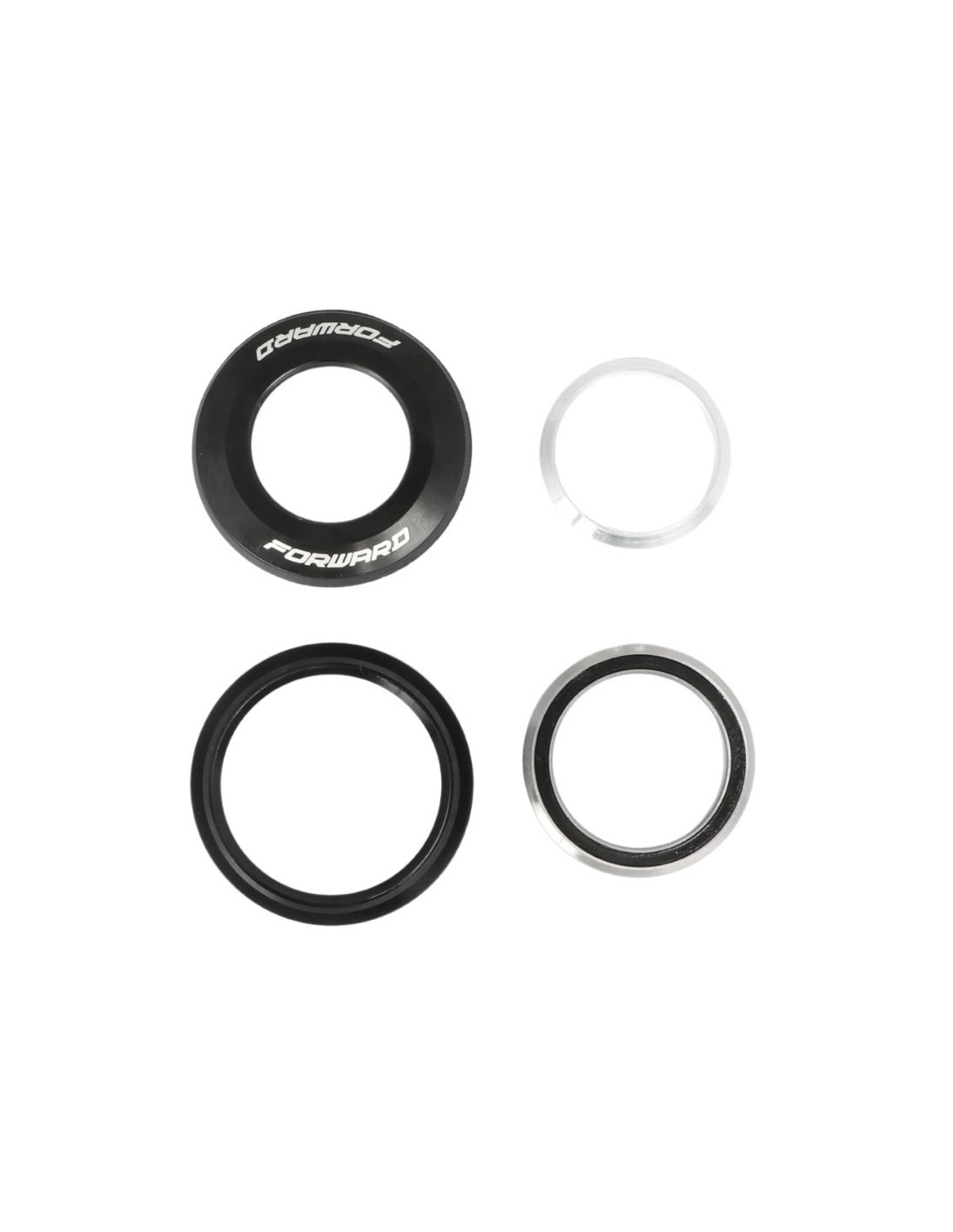 Le jeu de direction Forward est de type "semi-intégré " ou "ZS", conçu spécifiquement pour les cadres équipés d'une douille de direction 1-1/8" ou 1-1/8"-1.5" (Conique). Ce kit comprend la cuvette et roulement supérieur avec la bague de compression et le capot.