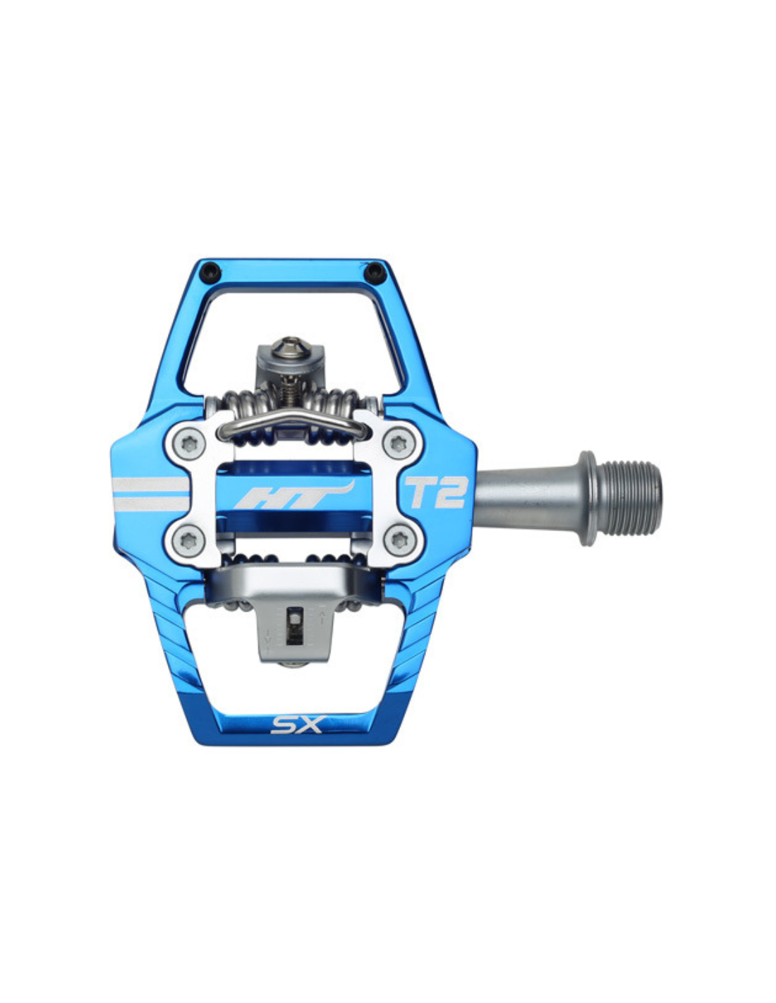 Les pédales HT T2 SX sont la référence dans le BMX Race. Elles sont conçues autour d'un corps en aluminium extrudé avant d'être usiné CNC pour une finition parfaite. On retrouve un axe en chromoly pour augmenter la résistance ainsi que la rigidité. Les pédales sont équipées des nouvelles plaques "Hook" afin de limiter tout déclispage lors des efforts. Grâce à la large plage de réglage, vous avez également la possibilité de modifier le tarage des ressorts en agissant sur les deux vis BTR pour s'adapter à pilote.