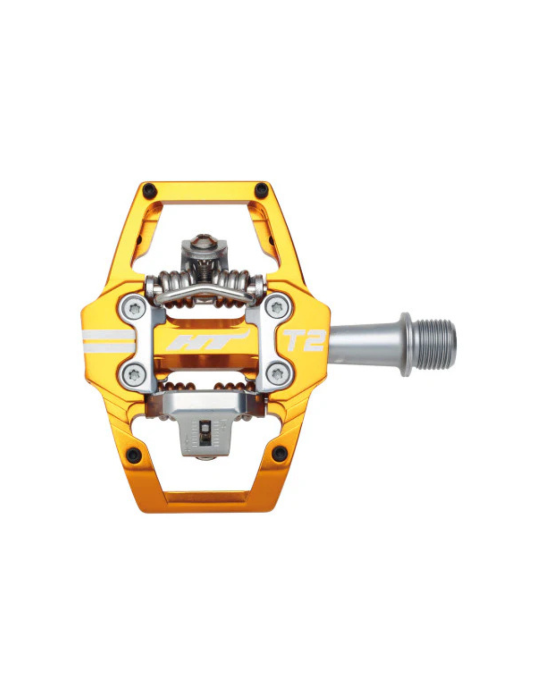 Les pédales HT T2 SX sont la référence dans le BMX Race. Elles sont conçues autour d'un corps en aluminium extrudé avant d'être usiné CNC pour une finition parfaite. On retrouve un axe en chromoly pour augmenter la résistance ainsi que la rigidité. Les pédales sont équipées des nouvelles plaques "Hook" afin de limiter tout déclispage lors des efforts. Grâce à la large plage de réglage, vous avez également la possibilité de modifier le tarage des ressorts en agissant sur les deux vis BTR pour s'adapter à pilote.