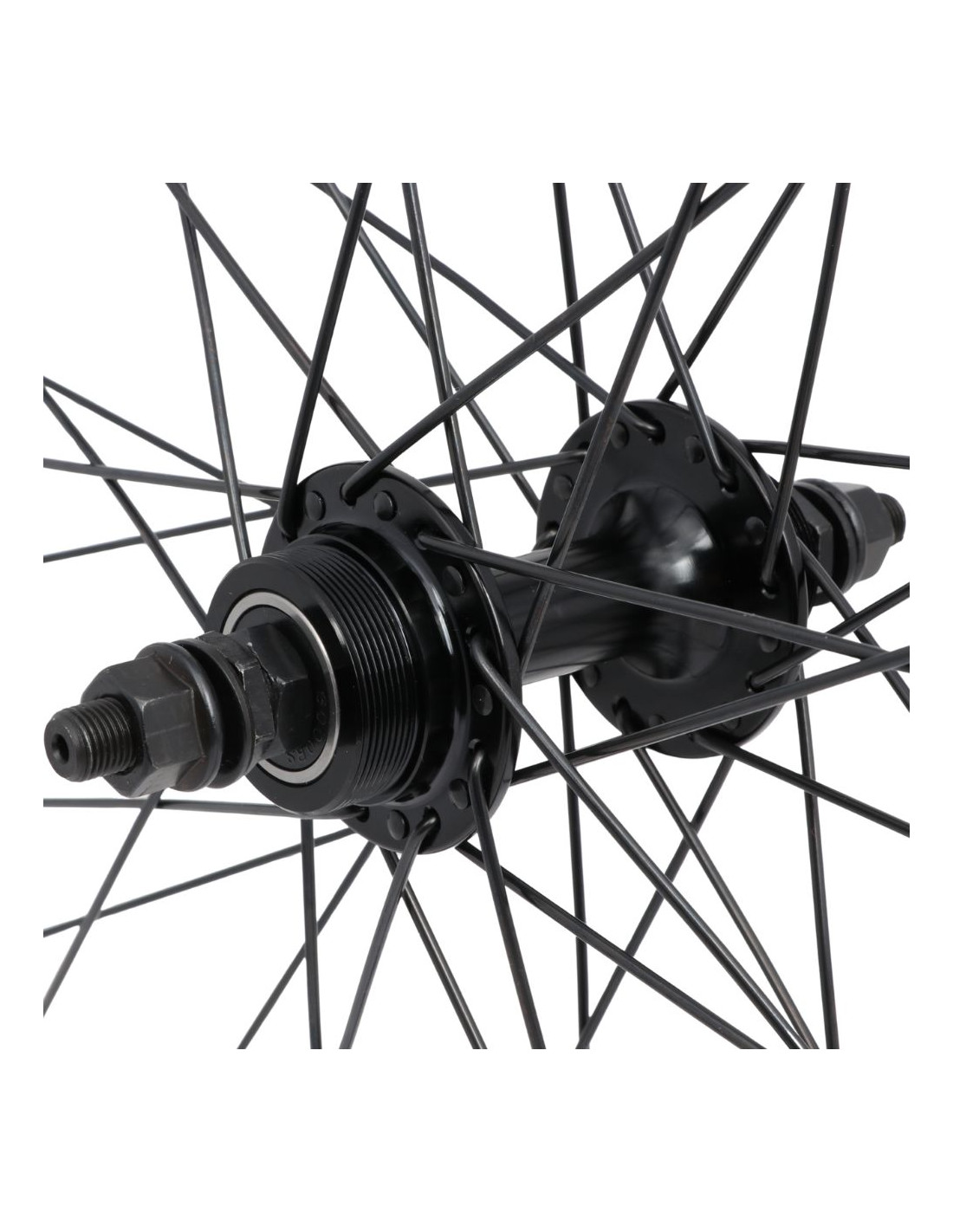 Elle est équipée d’un moyeu Forward Gen avec un corps en aluminium et des roulements scellés assurant une rotation fluide et une meilleure protection contre la poussière et l’humidité. Ce moyeu est prévu pour une transmission par roue libre. Le serrage de la roue s’effectue à l’aide de boulons de 15 mm, garantissant un maintien efficace.