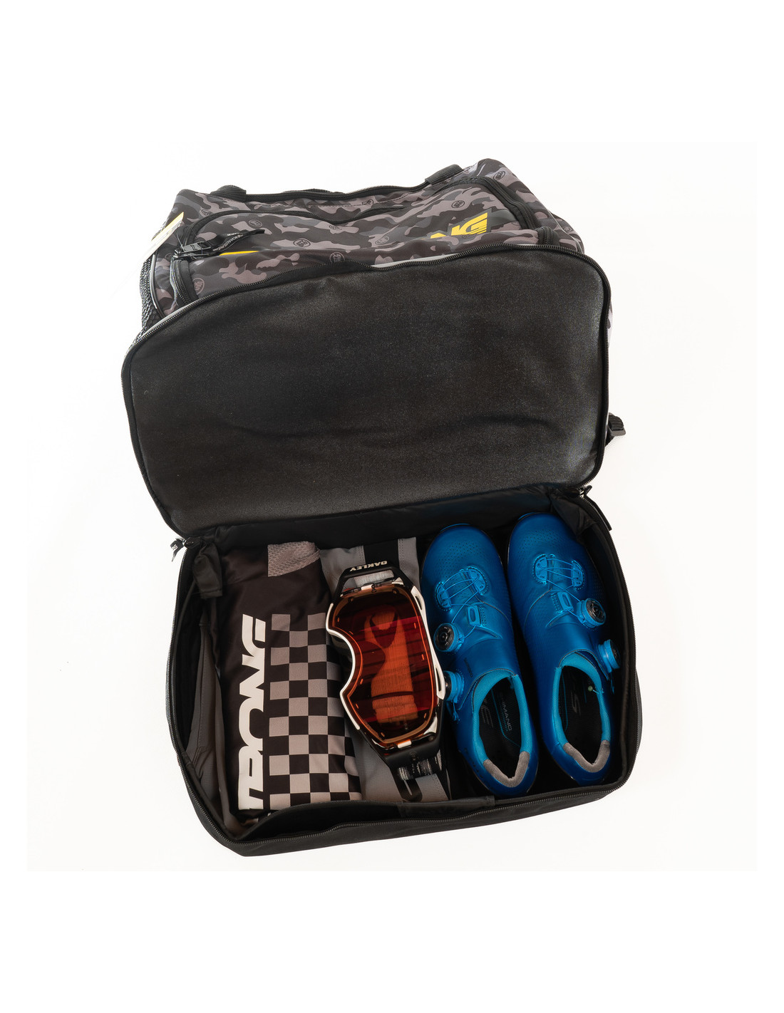 Il est composé d'un grand compartiment pour le casque ainsi que des rangements sur le côté pour placer sa gourde et un petit outillage. Le fond du sac est composé d'un emplacement dans lequel pourra être placé sa paire de chaussures ainsi que sa tenue pour rouler.