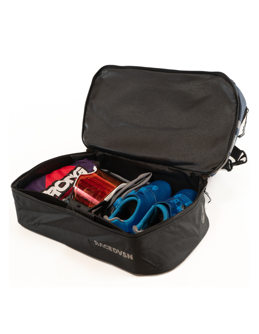 Il est composé d'un grand compartiment pour le casque ainsi que des rangements sur le côté pour placer sa gourde et un petit outillage. Le fond du sac est composé d'un emplacement dans lequel pourra être placé sa paire de chaussures ainsi que sa tenue pour rouler.
